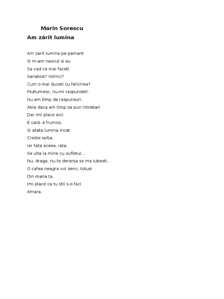 Marin Sorescu Am Zarit Lumina. E cald, e frumos, şi atâta lumină încât creşte iarba. E cald, e frumos, si atata lumina. E cald, e frumos, şi atâta lumină încât creşte iarba. Iar fata aceea, iata, se uita la mine cu sufletul. 8 decembrie 1996, bucureşti) şcoala primară o face în comuna natală.