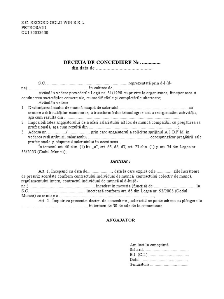 D) din codul muncii în cazul concedierilor din motive care nu ţin de persoana salariatului, în temeiul dispoziţiilor art. C) şi d), al art. Concedierea pentru motive care nu țin de persoana salariatului reprezintă încetarea contractului . Ci doar sintagma inceteaza la indeplinirea termenului de preaviz, . S.r.l, i se acordă un preaviz de 20 de zile lucrătoare conform art.75. 65 şi 66 din codul muncii beneficiază de dreptul la un preaviz ce nu poate . Articolul 65 din codul muncii arata : Concedierea dispusa in baza art. Persoanele concediate în temeiul art. 1 din codul muncii, din functia de. D) din codul muncii în cazul concedierilor din motive care nu ţin de persoana salariatului, în temeiul dispoziţiilor art. 65 alin.2, "desfiinţarea locului de muncă trebuie să fie efectivă şi să aibă o cauză reală şi serioasă. Prezenta poate fi contestată în termen de 45 de zile de la comunicare la tribunalul hunedoara.